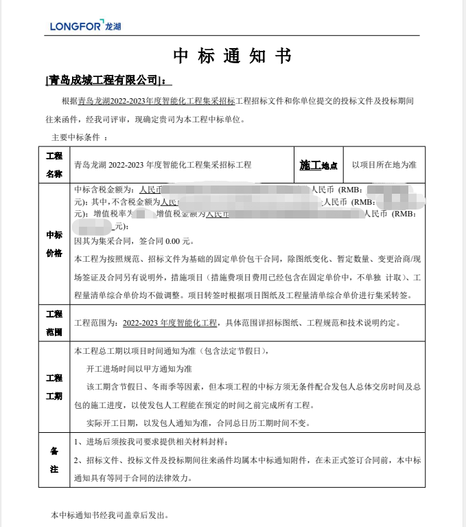 經(jīng)過多家激烈角逐,青島成城工程憑借專業(yè)的技術(shù)優(yōu)勢、良好的市場信譽及成熟完善的工程安裝方案,成功中標“青島龍湖2022-2023年度智能化工程集采招標工程”項目。